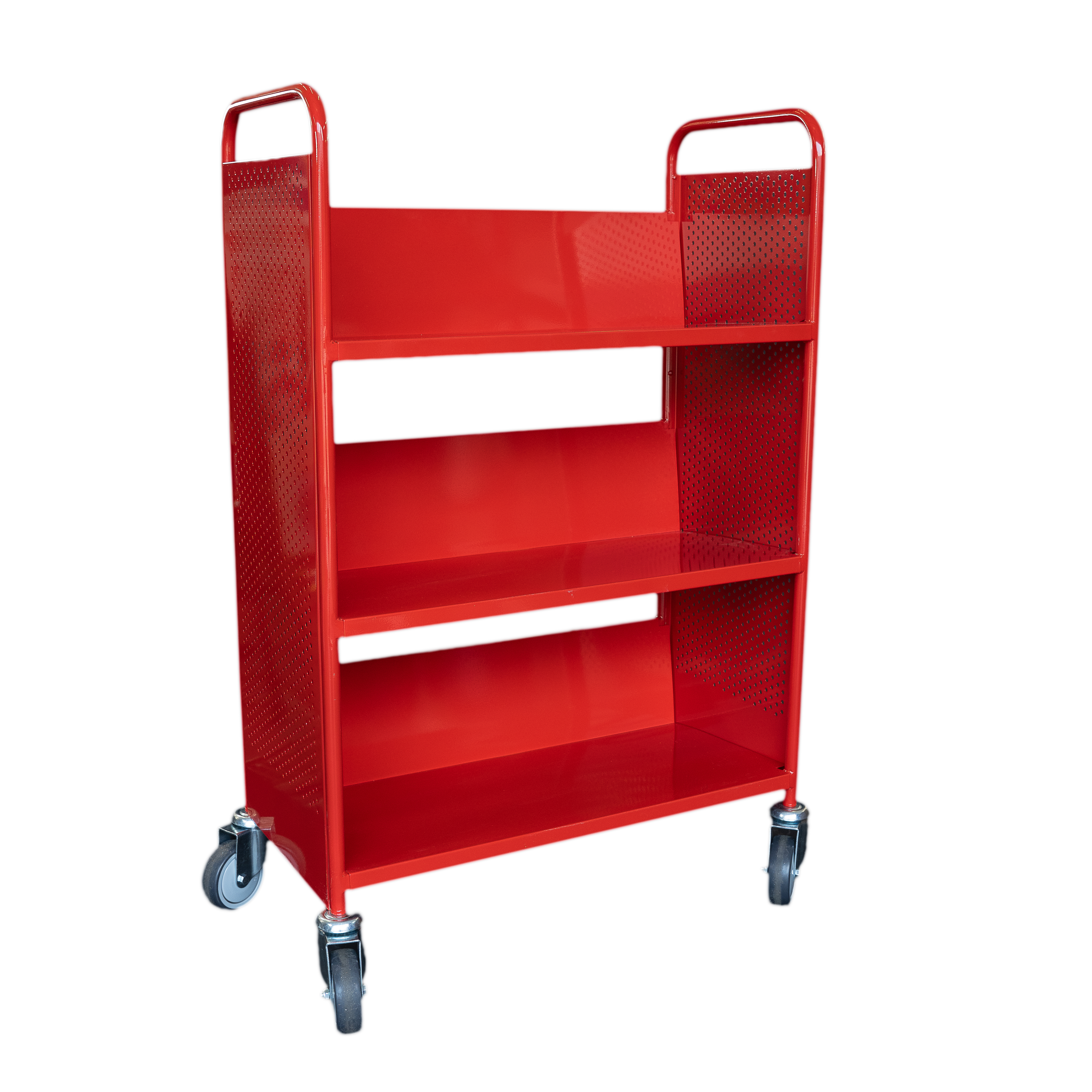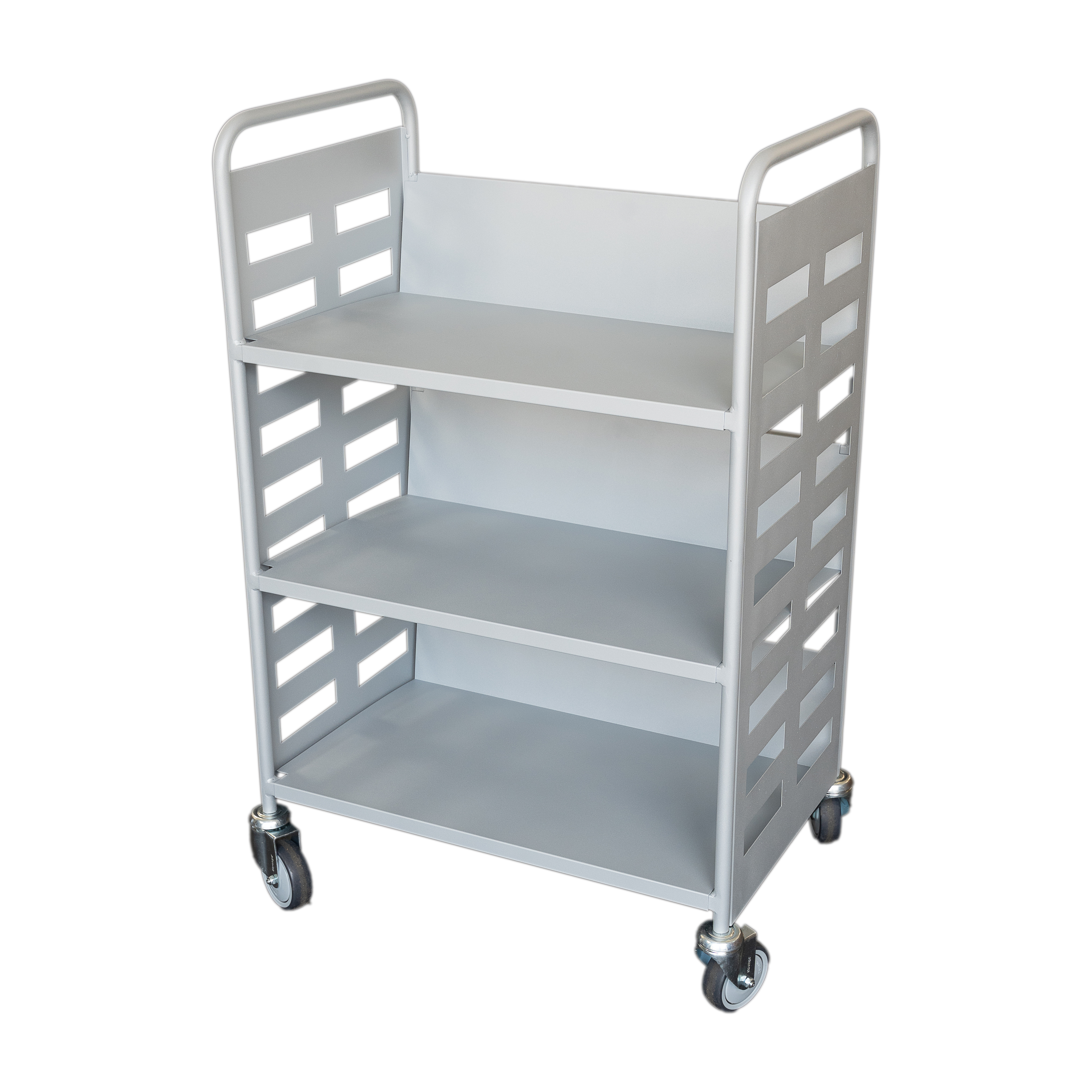 Malé rozměry, ale velká kapacita. Funkční, oboustranný knihovní vozík se zadním panelem a šesti nastavitelnými policemi (8 polic celkem). Z produkce EUROBIB.